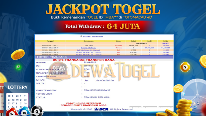 DEWATOGEL mengucapkan selamat kepada user id : MBA*** yang telah berhasil mendapatkan jackpot pada permainan TOGEL TOTOMACAU 4D POOLS. Kemenangan sebesar Rp 64.000.000 ,-. telah dibayarkan LUNAS oleh pihak dewatogel kepada pemilik user id setelah yang bersangkutan mengisi formulir withdraw. Proses pencairan dana berlangsung sangat cepat hanya dalam waktu 5-10 menit sudah berada dalam rekening pemilik user id. Bukti transfer yang dapat anda lihat adalah bukti SAH / VALID yang langsung di dapatkan melalui bukti transaksi dari Bank yang digunakan untuk pengiriman dana pada rekening pemilik user id. Terima kasih kami sampaikan kepada para pengguna setia DEWATOGEL yang telah menggunakan situs kami, sebagai Bandar Terpercaya yang pastinya membayar semua kemenangan member hingga lunas. Apakah DEWATOGEL PENIPU ? Reputasi “DEWATOGEL TERPERCAYA” sudah sangat melekat. puluhan hingga ratusan ribu pengguna setia DEWATOGEL tetap menggunakan situs terbesar dan terbaik di Indonesia ini. Hapus rasa was-was dan khawatir anda, kemenangan anda berapapun PASTI dibayarkan hingga lunas.
