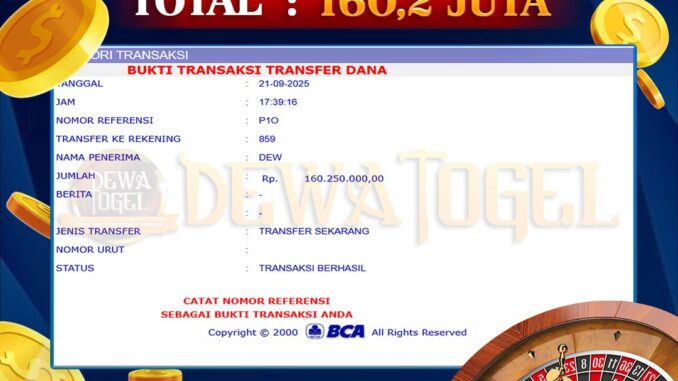 DEWATOGEL mengucapkan selamat kepada user id : FAE*** yang telah berhasil mendapatkan jackpot pada permainan LIVE CASINO DI SICBO DICE. Kemenangan sebesar Rp 160.200.000,-. telah dibayarkan LUNAS oleh pihak dewatogel kepada pemilik user id setelah yang bersangkutan mengisi formulir withdraw. Proses pencairan dana berlangsung sangat cepat hanya dalam waktu 5-10 menit sudah berada dalam rekening pemilik user id. Bukti transfer yang dapat anda lihat adalah bukti SAH / VALID yang langsung di dapatkan melalui bukti transaksi dari Bank yang digunakan untuk pengiriman dana pada rekening pemilik user id. Terima kasih kami sampaikan kepada para pengguna setia DEWATOGEL yang telah menggunakan situs kami, sebagai Bandar Terpercaya yang pastinya membayar semua kemenangan member hingga lunas. Apakah DEWATOGEL PENIPU ? Reputasi “DEWATOGEL TERPERCAYA” sudah sangat melekat. puluhan hingga ratusan ribu pengguna setia DEWATOGEL tetap menggunakan situs terbesar dan terbaik di Indonesia ini. Hapus rasa was-was dan khawatir anda, kemenangan anda berapapun PASTI dibayarkan hingga lunas.