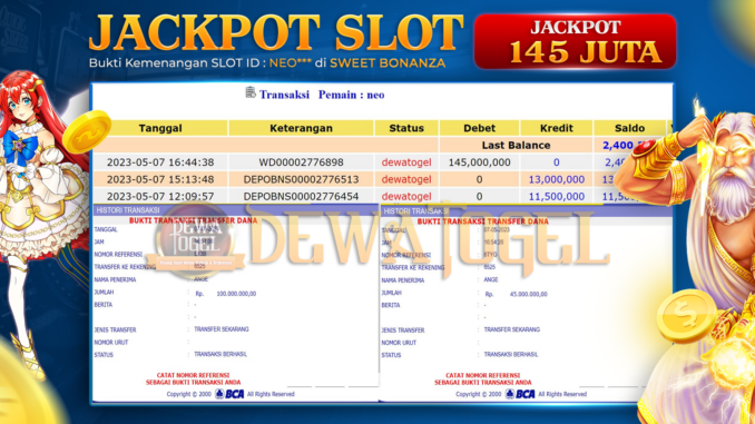 DEWATOGEL mengucapkan selamat kepada user id : NEO*** yang telah berhasil mendapatkan jackpot pada permainan SLOT di SWEET BONANZA. Kemenangan sebesar Rp 145.000.000,-. telah dibayarkan LUNAS oleh pihak dewatogel kepada pemilik user id setelah yang bersangkutan mengisi formulir withdraw. Proses pencairan dana berlangsung sangat cepat hanya dalam waktu 5-10 menit sudah berada dalam rekening pemilik user id. Bukti transfer yang dapat anda lihat adalah bukti SAH / VALID yang langsung di dapatkan melalui bukti transaksi dari Bank yang digunakan untuk pengiriman dana pada rekening pemilik user id. Terima kasih kami sampaikan kepada para pengguna setia DEWATOGEL yang telah menggunakan situs kami, sebagai Bandar Terpercaya yang pastinya membayar semua kemenangan member hingga lunas. Apakah DEWATOGEL PENIPU ? Reputasi “DEWATOGEL TERPERCAYA” sudah sangat melekat. puluhan hingga ratusan ribu pengguna setia DEWATOGEL tetap menggunakan situs terbesar dan terbaik di Indonesia ini. Hapus rasa was-was dan khawatir anda, kemenangan anda berapapun PASTI dibayarkan hingga lunas.